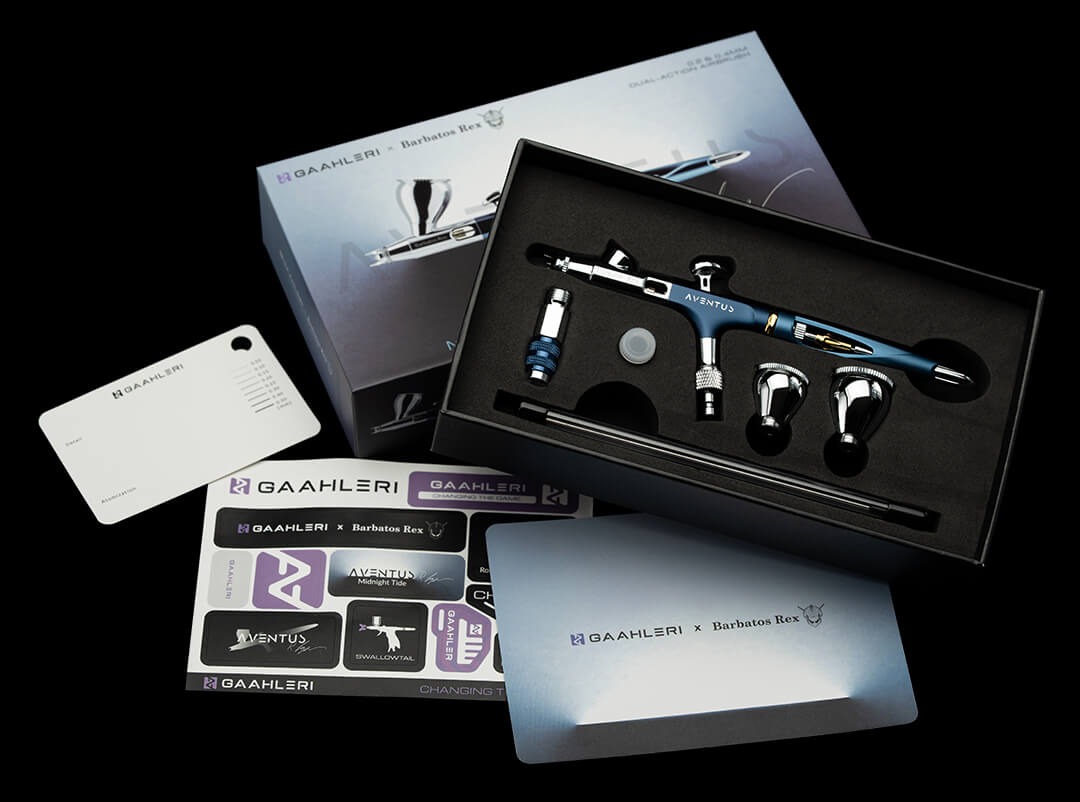 有名YouTuber 「Barbatos Rex」とのコラボレーションエアブラシ。独創的で美しいデザインと強化された性能を誇るこのエアブラシは、精度、コントロール、そしてスタイルを兼ね備え、究極のクリエイティビティを実現します。Barbatos Rex限定ステッカーと、限定版メス型クイックディスコネクトアダプターが付属します。