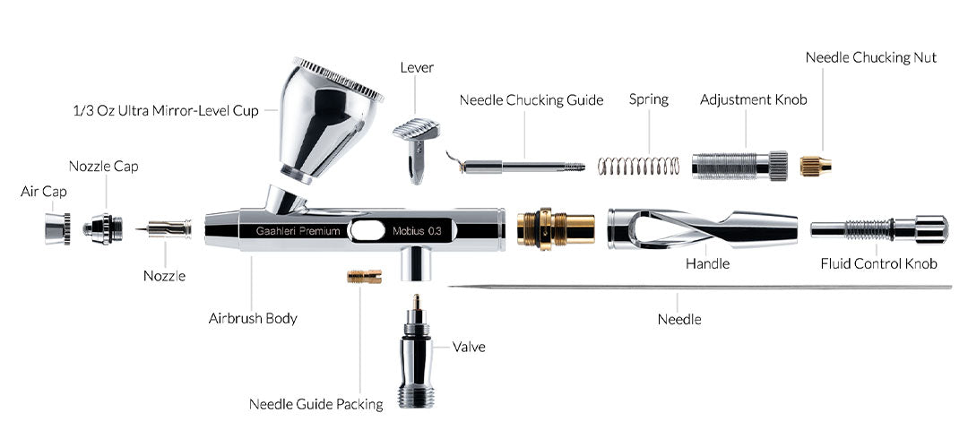 特許出願中の Mobius カッタウェイは、視覚的なフィードバックとトリガースプリングの張力の簡単な調整を提供し、パーソナライズされた快適なエアブラシ体験を実現します。