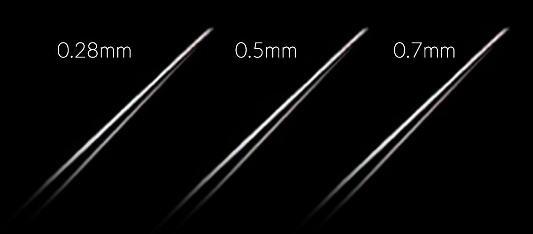Barbatos Rex Swallowtail エアブラシには 3 種類の針サイズが含まれています。0.28mm は細かい作業や精密作業に最適で、0.5mm と 0.7mm は広い表面のエアブラシ作業に適しています。