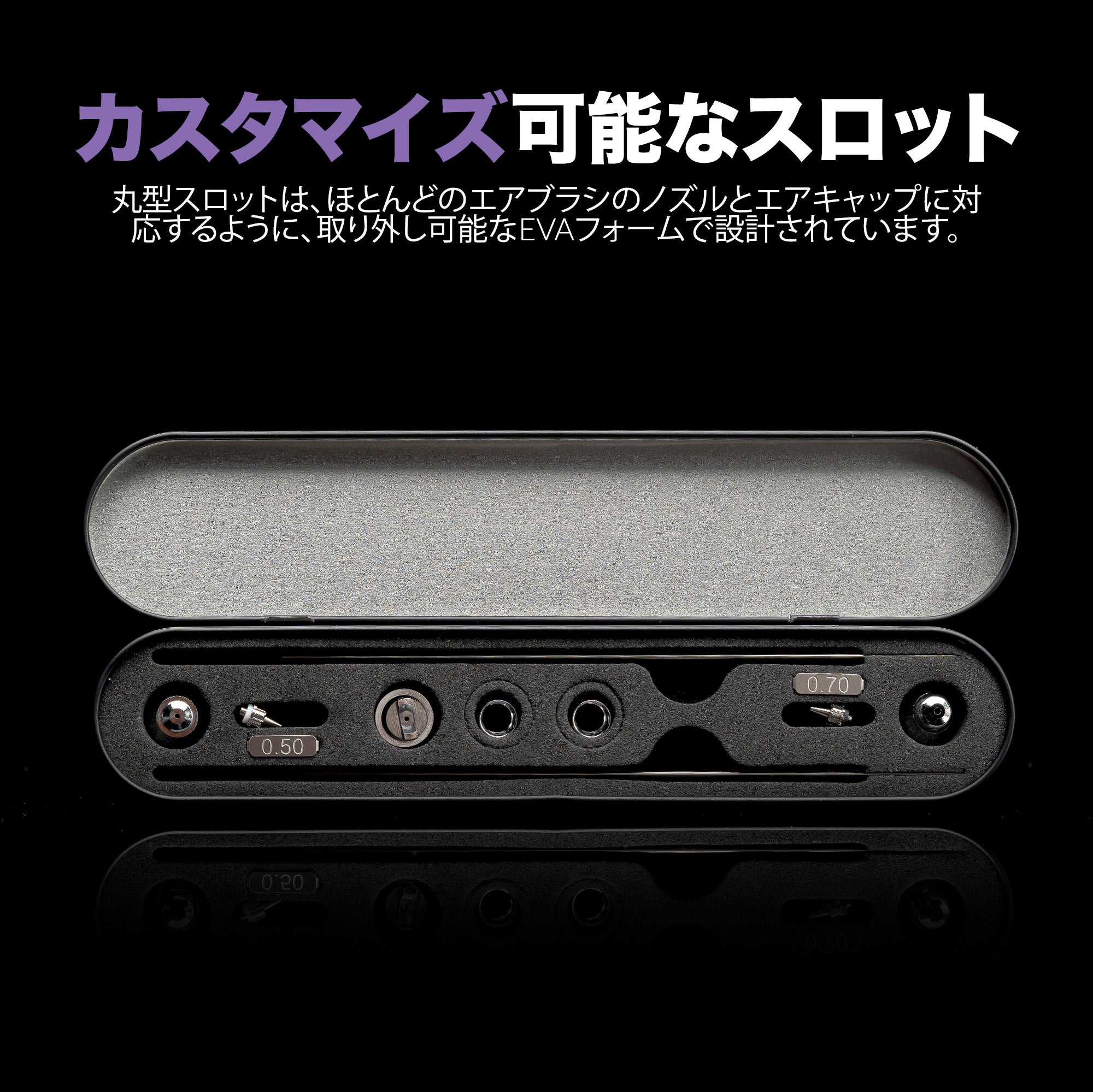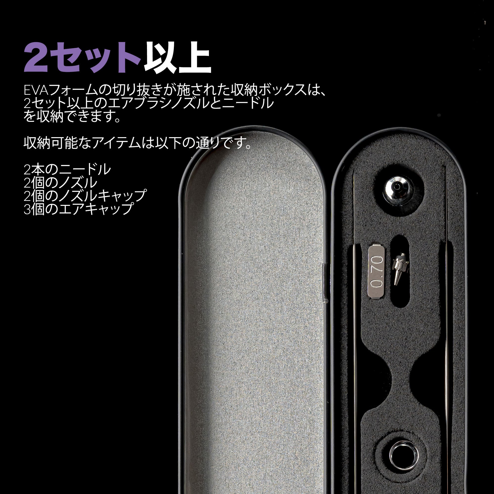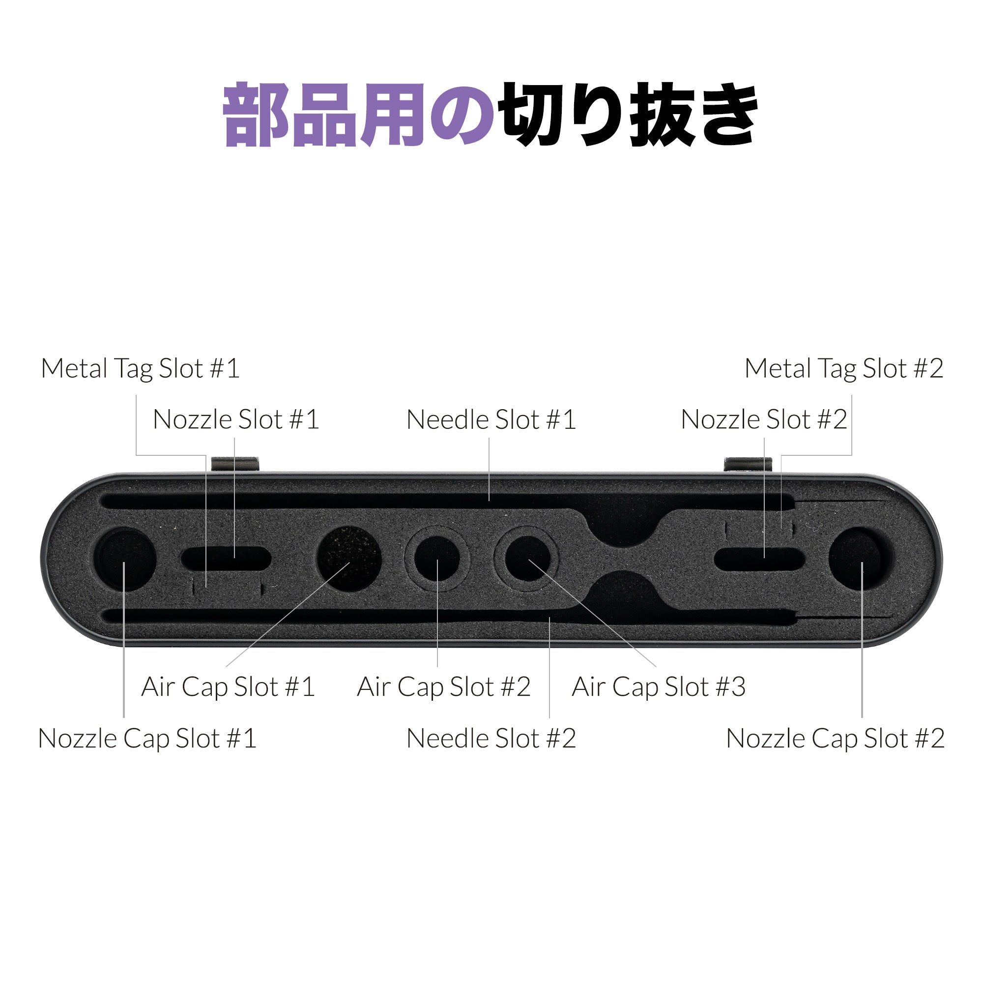 2セット以上収納可能:汎用性の高いEVAフォーム製の切り抜き部分を備えたこのボックスには、エアブラシのノズル、ニードルなどを最大2セット収納できます。収納可能なものは以下の通りです。