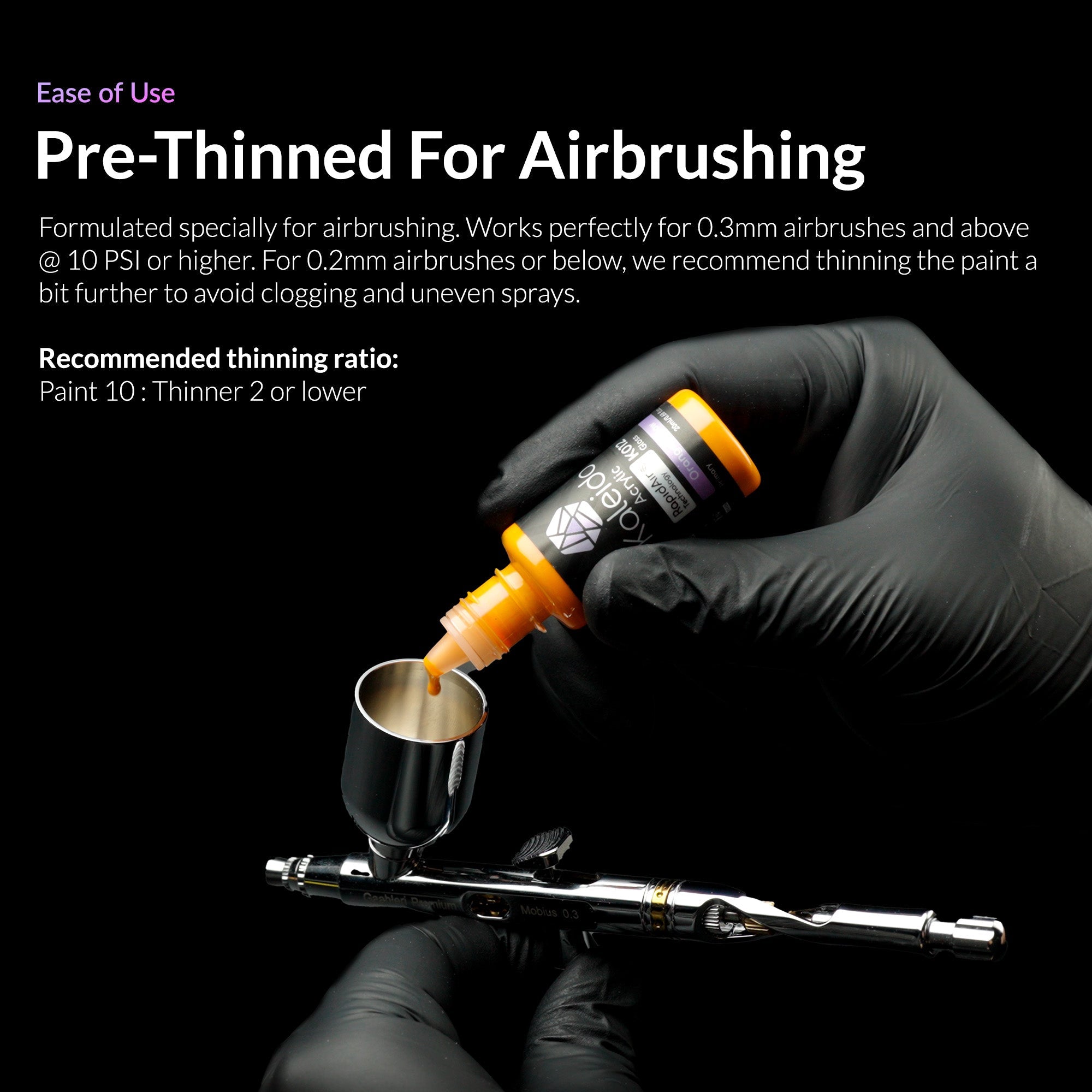 - カレイド塗料は水性アクリルのプレシンタイプで、0.3~0.5mmのエアブラシでボトルから直接使用できます。
