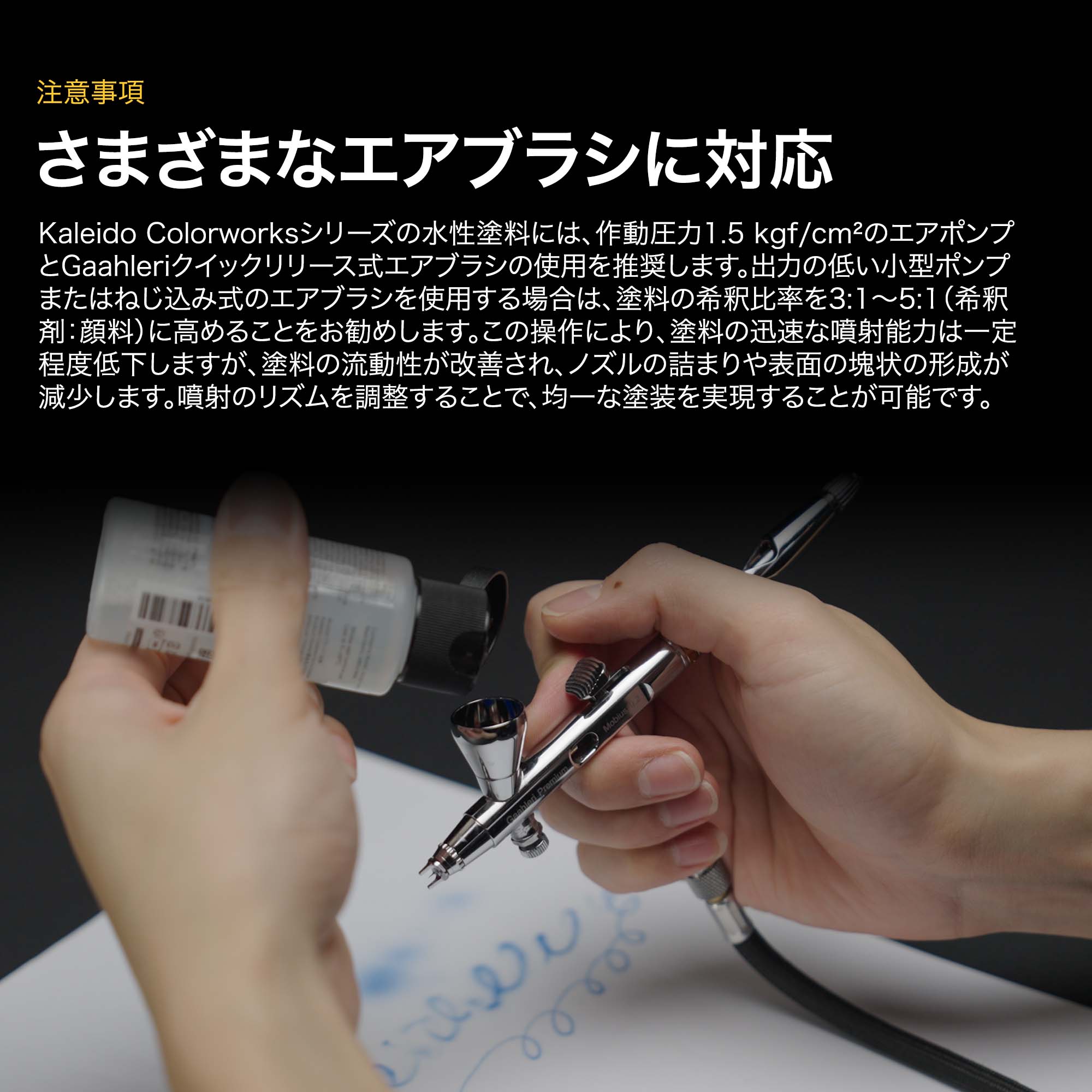 - カレイド塗料は水性アクリルのプレシンタイプで、0.3~0.5mmのエアブラシでボトルから直接使用できます。