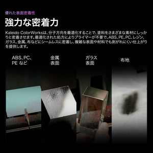 Kaleido Colorworks RapidAir™シリーズは、滑らかで高性能なスプレー塗装のために設計されたプレミアム水性アクリル塗料です。環境に優しく、無毒で、溶剤を一切含まないエコフレンドリーな処方で、工場出荷時に事前準備済みのため、そのまま使用することも、簡単に薄めて使用することも可能です。テクノロジーにより、水性塗料でよくある「遊び」「ムラ」「タレ」といった問題を解決し、均一でシート状の塗膜を形成します。 この先進的な処方は、強力な密着性、耐傷性、耐久性を発揮し、溶剤系塗料に敵対する光沢仕上げを実現します。 プライマーは不要で、ABS・PE・PC・レジン・ガラス・布・金属など幅広い素材に対応。