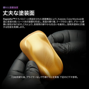 Kaleido Colorworks RapidAir™シリーズは、滑らかで高性能なスプレー塗装のために設計されたプレミアム水性アクリル塗料です。環境に優しく、無毒で、溶剤を一切含まないエコフレンドリーな処方で、工場出荷時に事前準備済みのため、そのまま使用することも、簡単に薄めて使用することも可能です。テクノロジーにより、水性塗料でよくある「遊び」「ムラ」「タレ」といった問題を解決し、均一でシート状の塗膜を形成します。 この先進的な処方は、強力な密着性、耐傷性、耐久性を発揮し、溶剤系塗料に敵対する光沢仕上げを実現します。 プライマーは不要で、ABS・PE・PC・レジン・ガラス・布・金属など幅広い素材に対応。