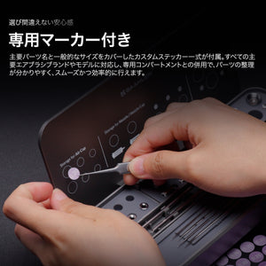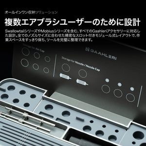 カスタムフィットのシリコントレイ、ナノ滑り止めパッド、そして整理整頓に役立つラベルシールが付属しています。SwallowtailやMobiusを含むGaahleriの全モデルに加え、市販されているほとんどの主要エアブラシブランドにも対応しています。