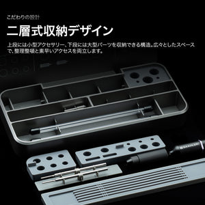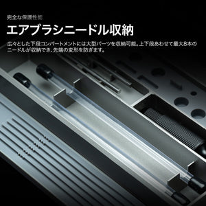 2段式のモジュラーレイアウトを採用し、ノズル、ニードル、キャップから大型パーツまで、エアブラシのセットアップ全体を安全に収納できます。上段にはファンキャップ6個、ノズルセット7個、ニードル最大8本を収納でき、折れ曲がったり損傷したりするのを防ぐ保護機能も備えています。下段には、大型パーツやアクセサリーを収納できる広々としたスペースがあります。